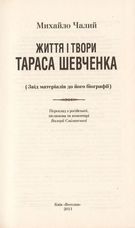 Чалий М. К. Життя і твори Тараса Шевченка : (звід матеріалів до його біогр.) / Михайло Чалий ; пер., післям. та комент. В. Л. Смілянської. – К. : Веселка, 2011. – 263 с. : іл.