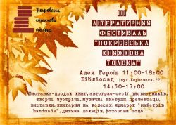 - 11:00 – Офіційне відкриття Третього літературного фестивалю «Покровська книжкова толока».