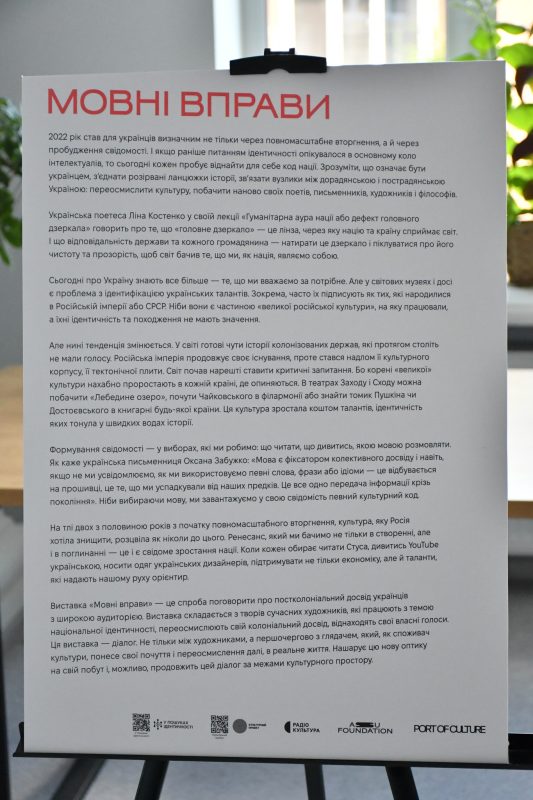 Ця подія об’єднує роботи українських митців, присвячені темам мовної ідентичності, деколонізації та ролі української мови в нашому щоденному житті, підкреслюючи її відмінність від мови сусіда-агресора.