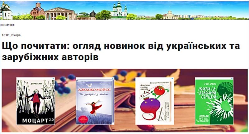 Проєкт «Літпорада», який реалізується Чернігівською Медіа Групою у партнерстві з Чернігівською міською бібліотекою імені М. М. Коцюбинського, Продовжує огляд новинок від українських та зарубіжних авторів. Сьогодні добірку видань пропонує чернігівська письменниця, співробітниця бібліотеки Олена Терещенко.