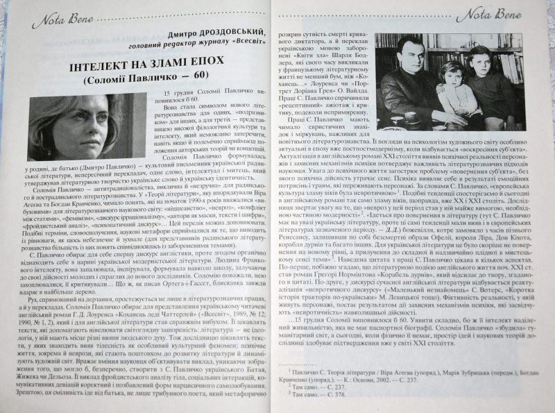 Дроздовський Д. Інтелект на зламі епох : (Соломії Павличко – 60) / Дмитро Дроздовський // Всесвіт. – 2018. – № 11-12.- С. 4-5.